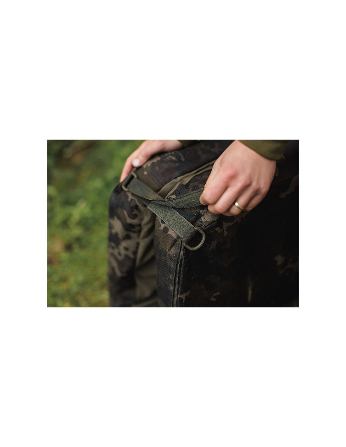 Mittels der 4 Eckringe mit Klettverschlüssen und der großen zentralen Schnalle lässt sich die Compac Hybrid Mat Dark Kamo perfekt für den Transport zusammenfalten.