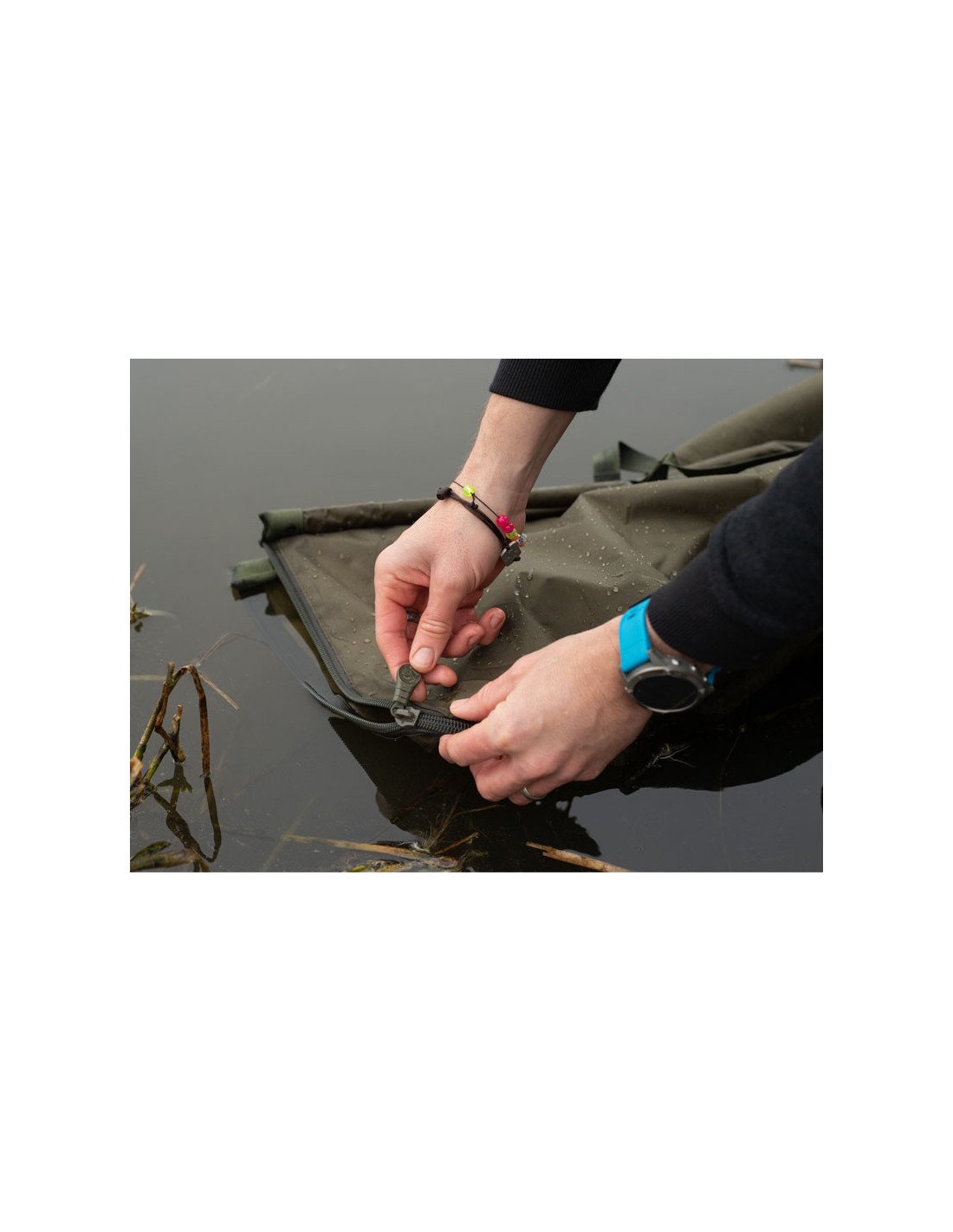 Zudem ist an den Stangen der Schlinge, auf jeder Seite, ein Griff, aus Gurtband, befestigt. Diese Griffe sorgen zusammen, während dem Wiegen, für die notwendige Balance. Der Reißverschluss hingegen verhindert das Herausrutschen des Karpfens.