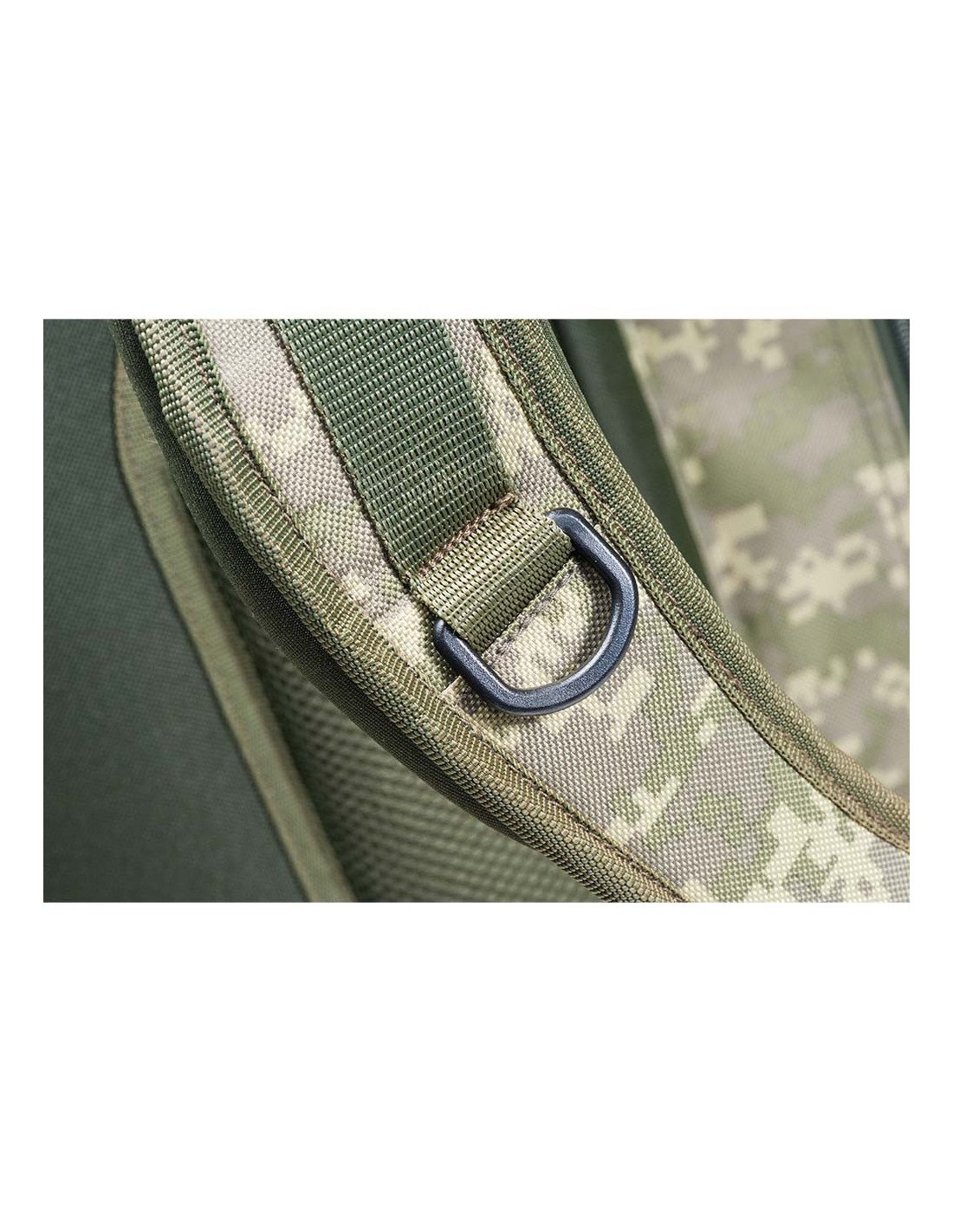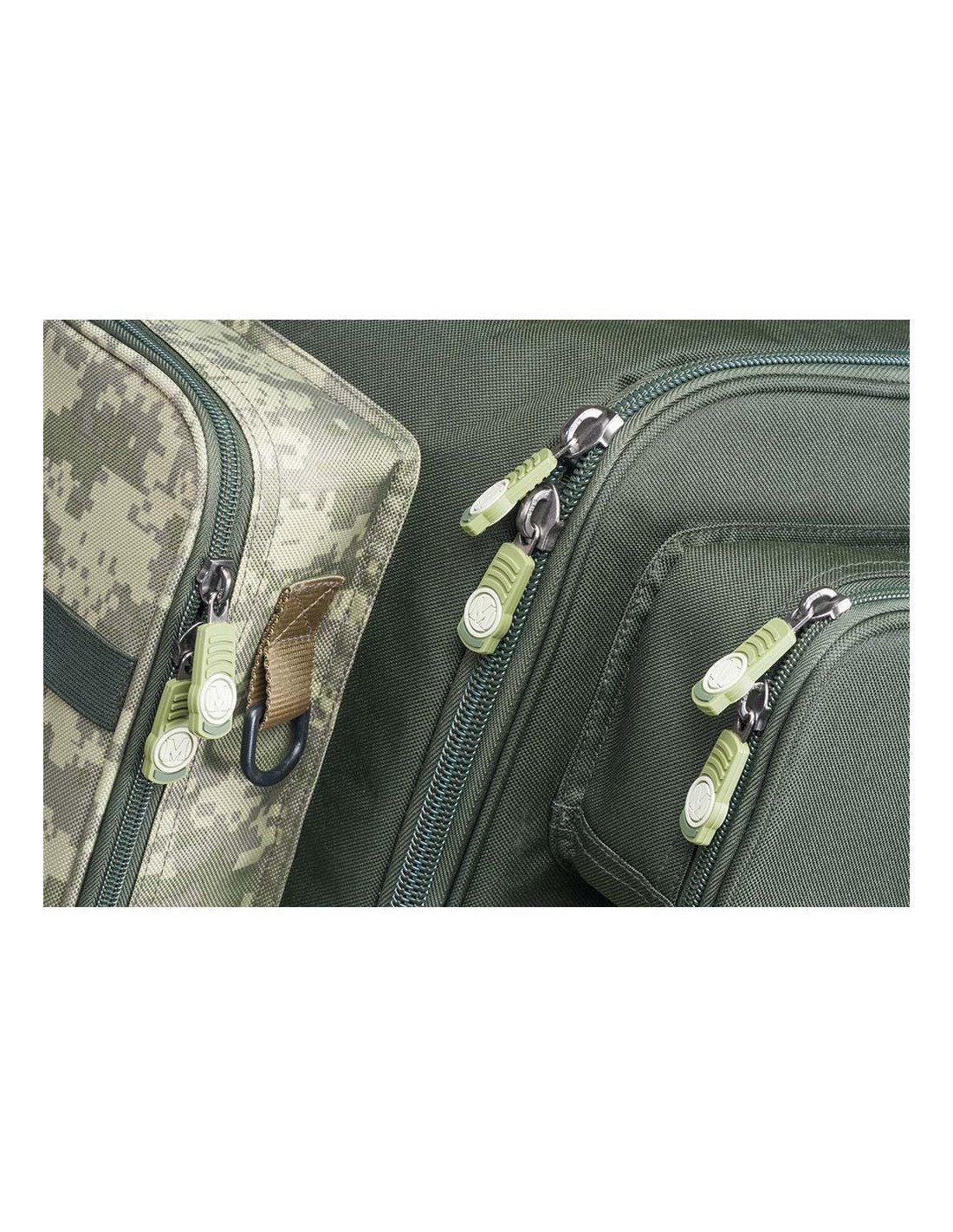 Hervorzuheben ist auch noch seine kompakte Größe, die dir die Möglichkeit dazu bietet, den Rucksack bequem unter deinem Bedchair zu verstauen. Darüber hinaus verfügt er an der Ober- und Unterseite über Tragegriffe, wodurch du ihn, auch in vollgepacktem Zustand, ziehen oder quer tragen kannst. Dies wird dir gelegen kommen, wenn du dein Auto oder deinen Trolley Be- oder Entladen willst.