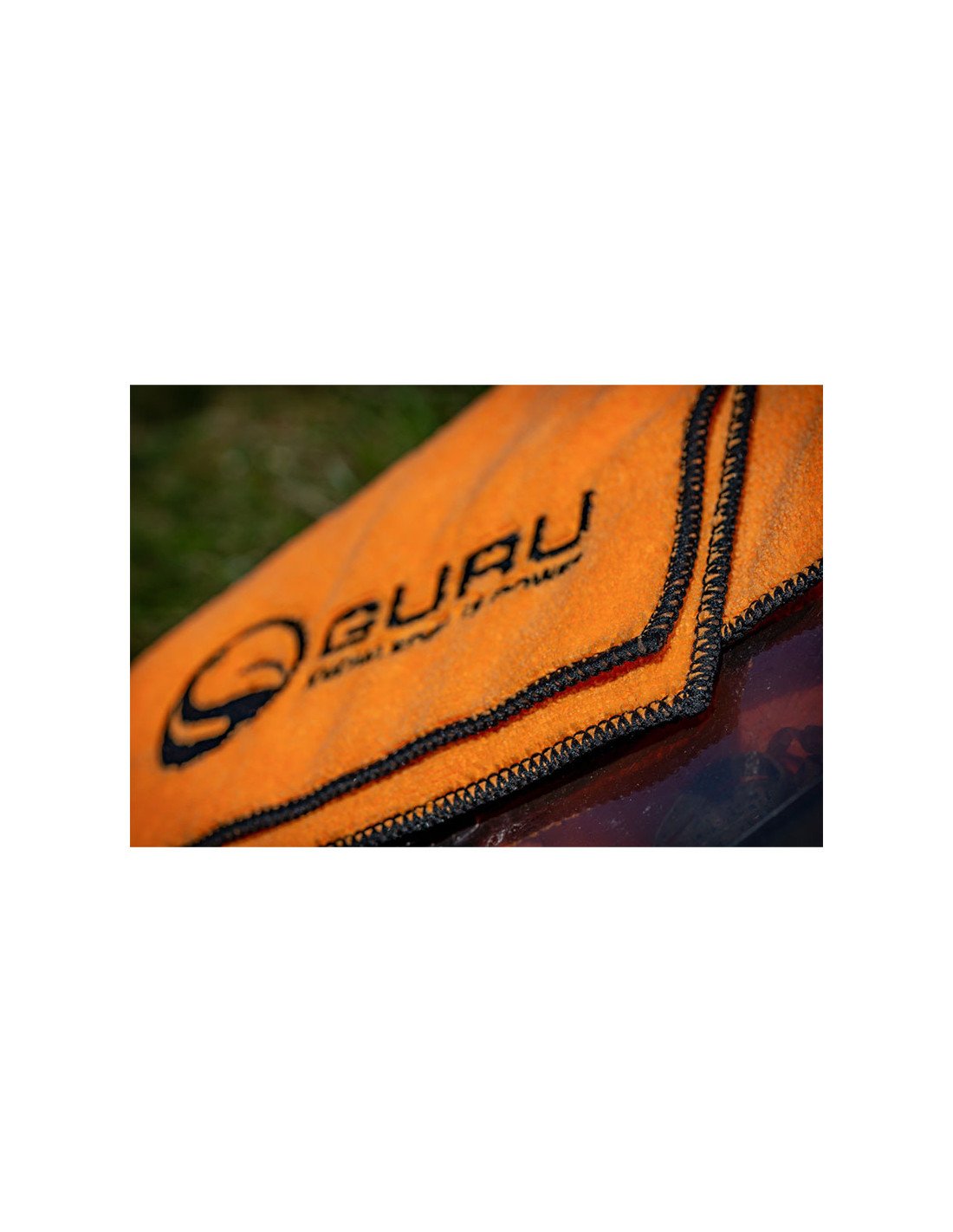Auf dem hochwertigen, vorwiegend orangenen Handtuch hebt sich das in schwarz gehaltene Guru-Logo wunderbar ab und stellt einen richtigen Hingucker dar.