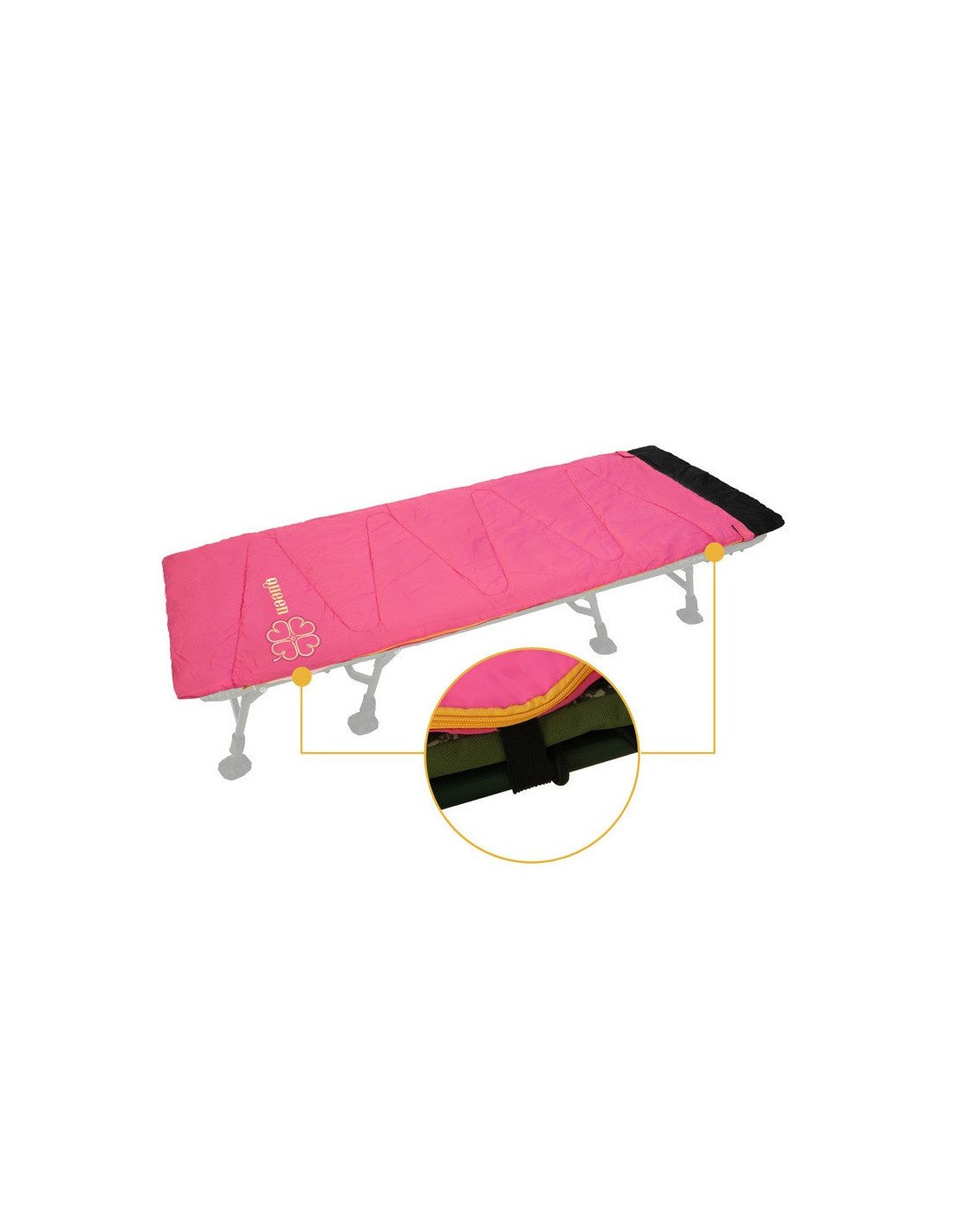 Optisch sticht der QUEEN Schlafsack sofort hervor: Das elegante Rosa, veredelt mit goldfarbenen Details, fügt sich perfekt in die QUEEN-Serie ein und verleiht Deinem Setup am Wasser einen besonderen Akzent.