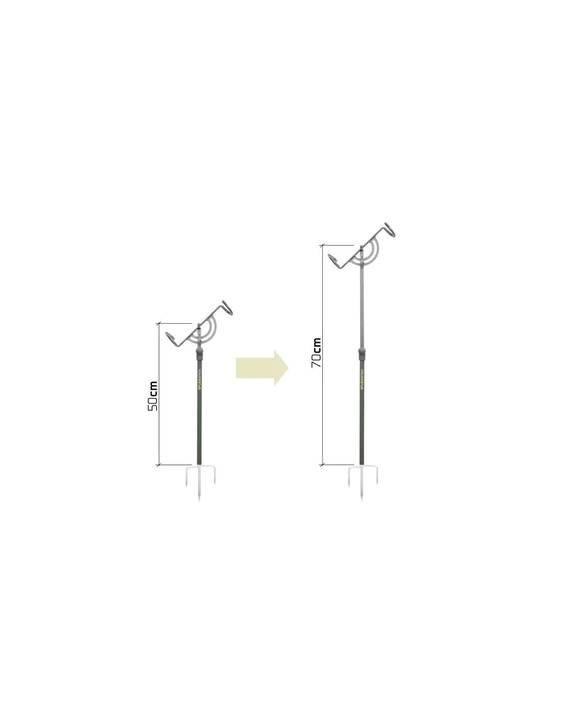 Die teleskopische Stange in dunkelgrüner Farbe ist ausziehbar und besitzt eine quadratische Form, wodurch ein Verdrehen verhindert wird. Ein stabiler Metalldreizack sorgt für sicheren Halt im Boden, selbst auf härteren Untergründen.