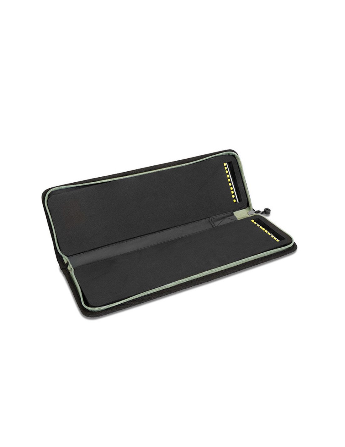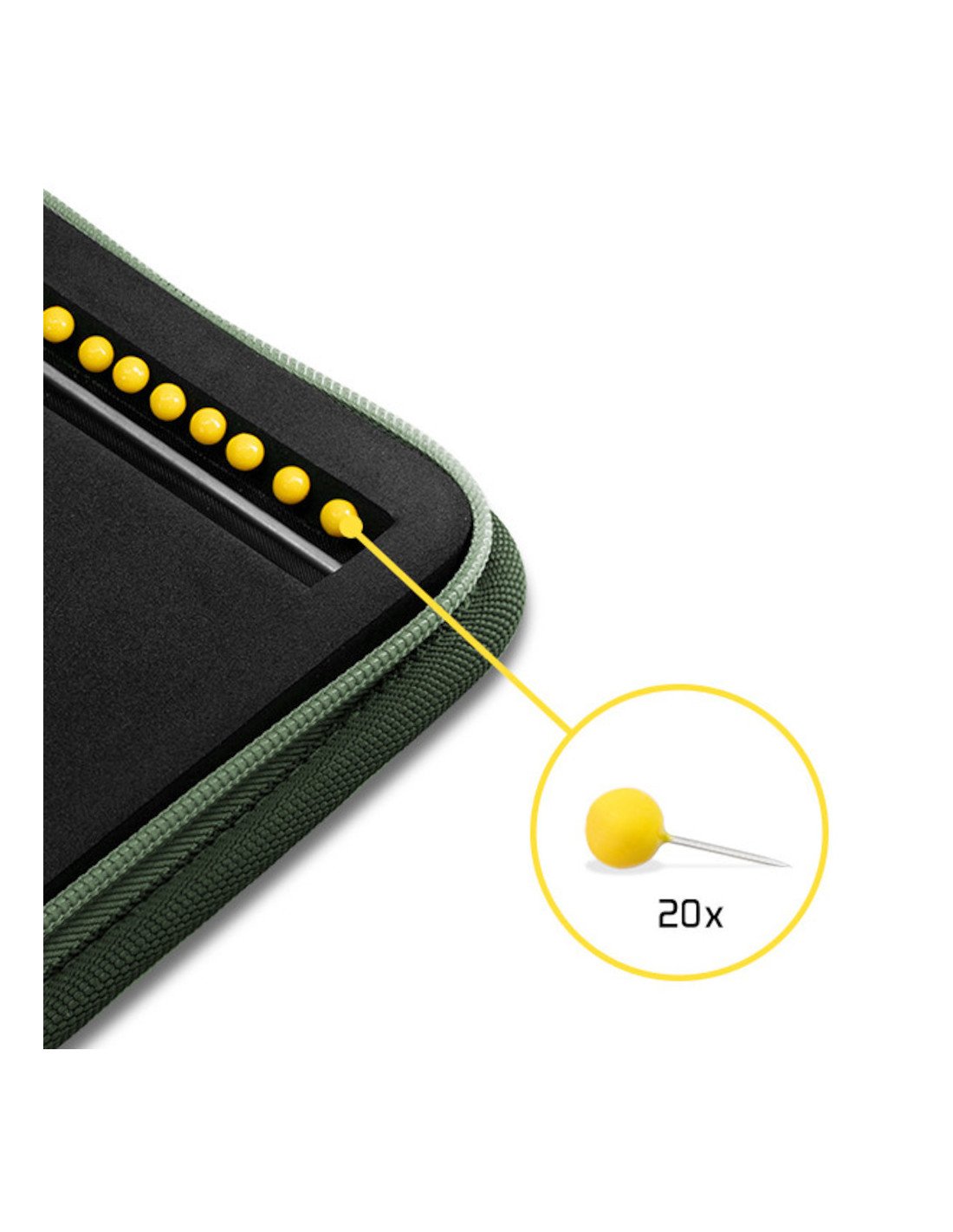 In den Ausschnitten befinden sich die Stahlstangen zum Auffangen der Vorfachhaken. Zum Spannen und Befestigen der Vorfächer auf dem Schaumstoff ist das Etui mit 20 Stiften ausgestattet, die es ermöglichen, immer eine ausreichende Menge an vorbereiteten Vorfächern zur Verfügung zu haben, was sowohl von den Anfängern als auch von den erfahrenen Anglern geschätzt wird.