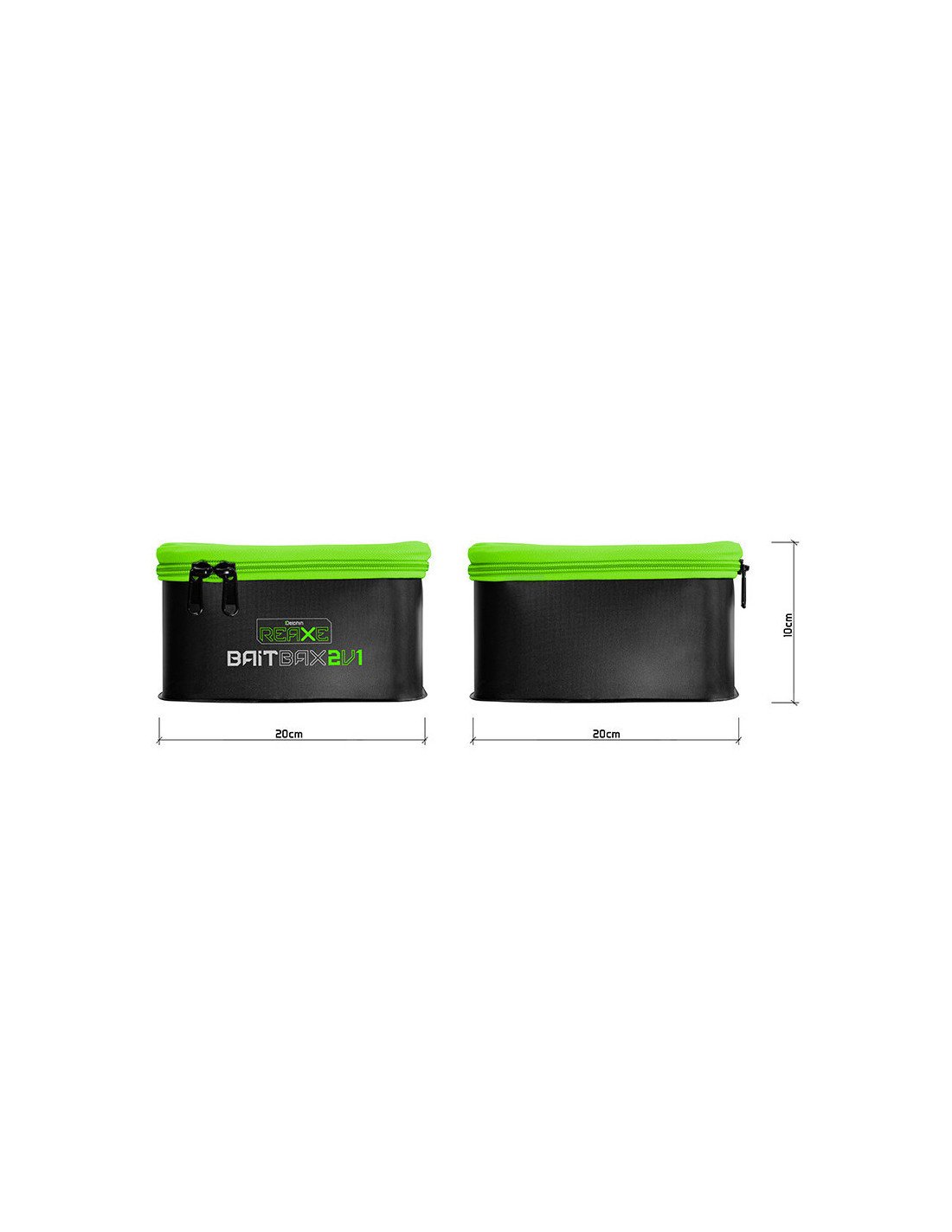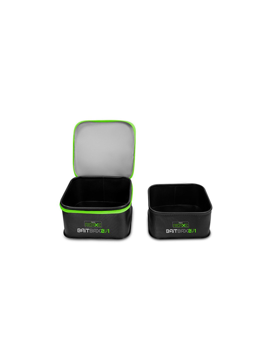 Das EVA BaitBAX Set ist schwarz in der Kombination mit der markanten grünen Grafik und passt somit perfekt zu den anderen Produkten der REAXE Feeder-Serie. Die Tasche ist mit einem hochwertigen Reißverschluss ausgestattet, der für einen vollständigen Verschluss sorgt. Die einzelnen Komponenten des Sets passen perfekt ineinander, so dass Sie sie nach dem Ausflug leicht wieder zusammensetzen können, um Platz in Ihrer Ausrüstung zu sparen.