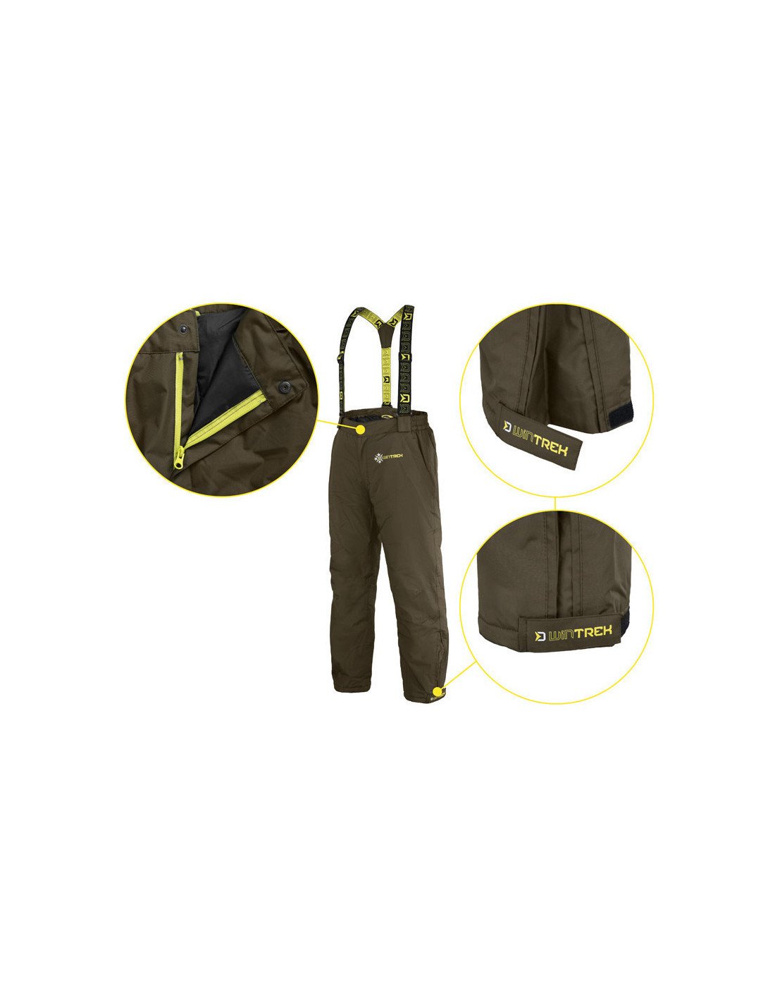 Die WinTREK-Hose hat auf beiden Seiten die Reißverschlusstaschen, die Reißverschlüsse sind mit einem auffälligen gelben Stoff abgesteppt und mit einem Saum aus dem wasserabweisenden Stoff abgedeckt. Die elastischen Taillengurte sind auf Ihre Körpergröße einstellbar und mit den Klettverschlüssen komplett abnehmbar. Der Gürtel selbst hat ein eingenähtes Gummiband, das seine Flexibilität und Elastizität erhöht. Die Innenseite besteht aus einem glatten, gesteppten Stoff, wodurch sich die Hose leicht anziehen und gut tragen lässt.
