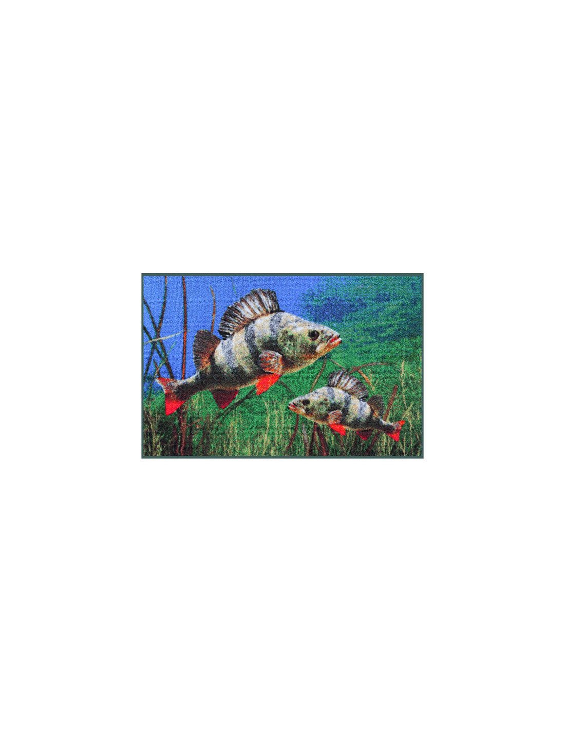 Ein hervorragend verarbeiteter Teppich mit einem 3D-Motiv eines Barschs unter Wasser.