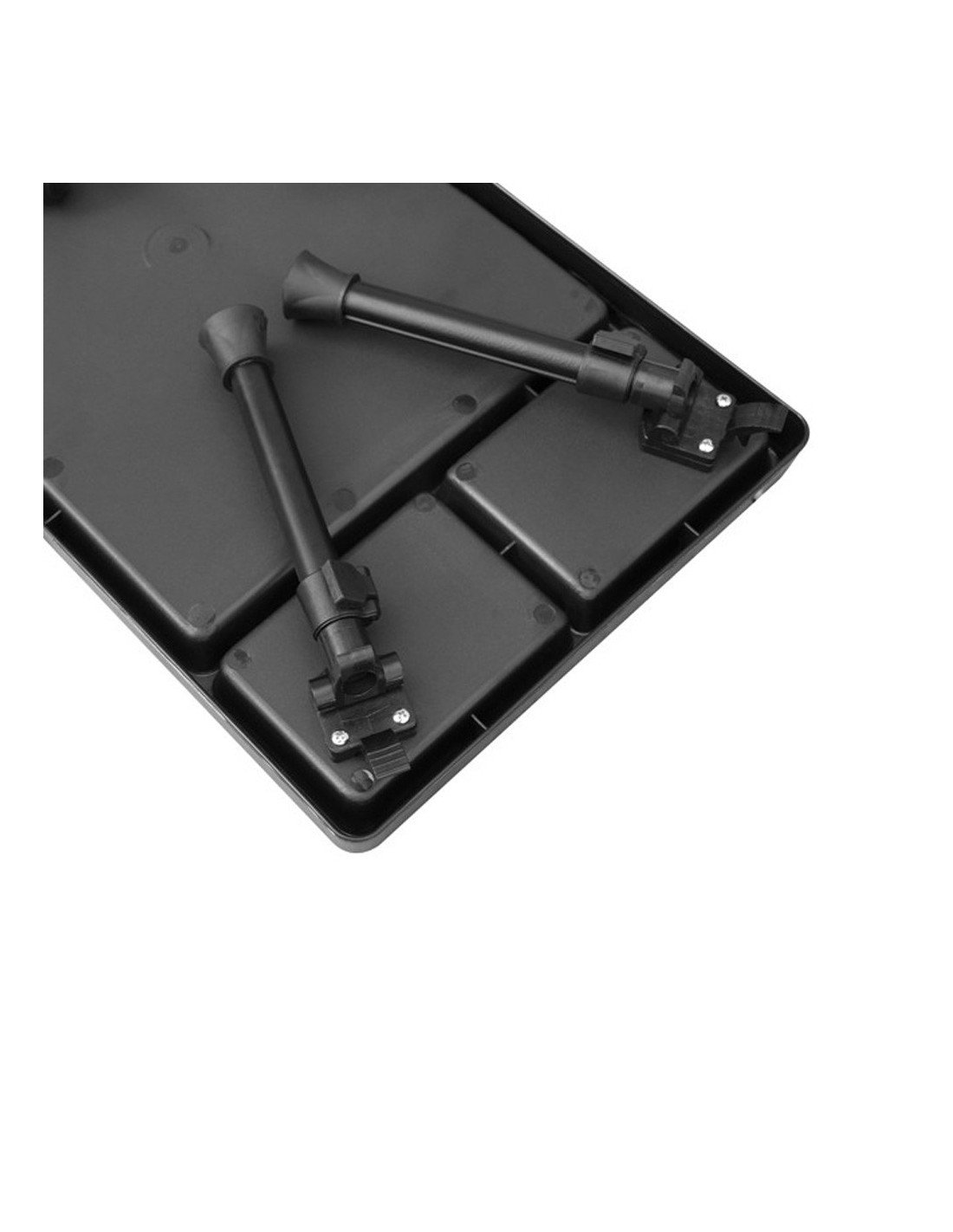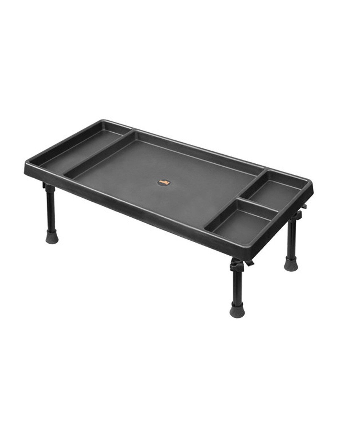 Seine Arbeitsfläche ist in mehrere Fächer unterteilt. Nutzen kannst du diese beim Montagebinden, um die einzelnen Komponenten, in jeweils einem Fach, aufzubewahren. Beim Feederfischen hingegen kannst du in diesen Fächern Köder und Feederkörbe lagern.