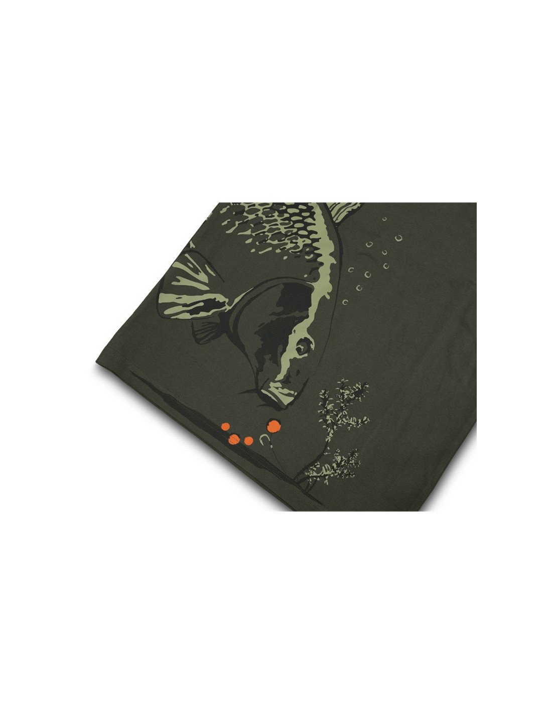 Es ist aus einem dunkelgrünen Material gefertigt, das sich perfekt in die natürliche Umgebung einfügt. Das Karpfenbild geht im unteren Bereich um den ganzen Oberkörper herum. Der Karpfen ist wie eine Skizze oder ein Gemälde dagestellt, wobei alle wichtigen Details erhalten bleiben.