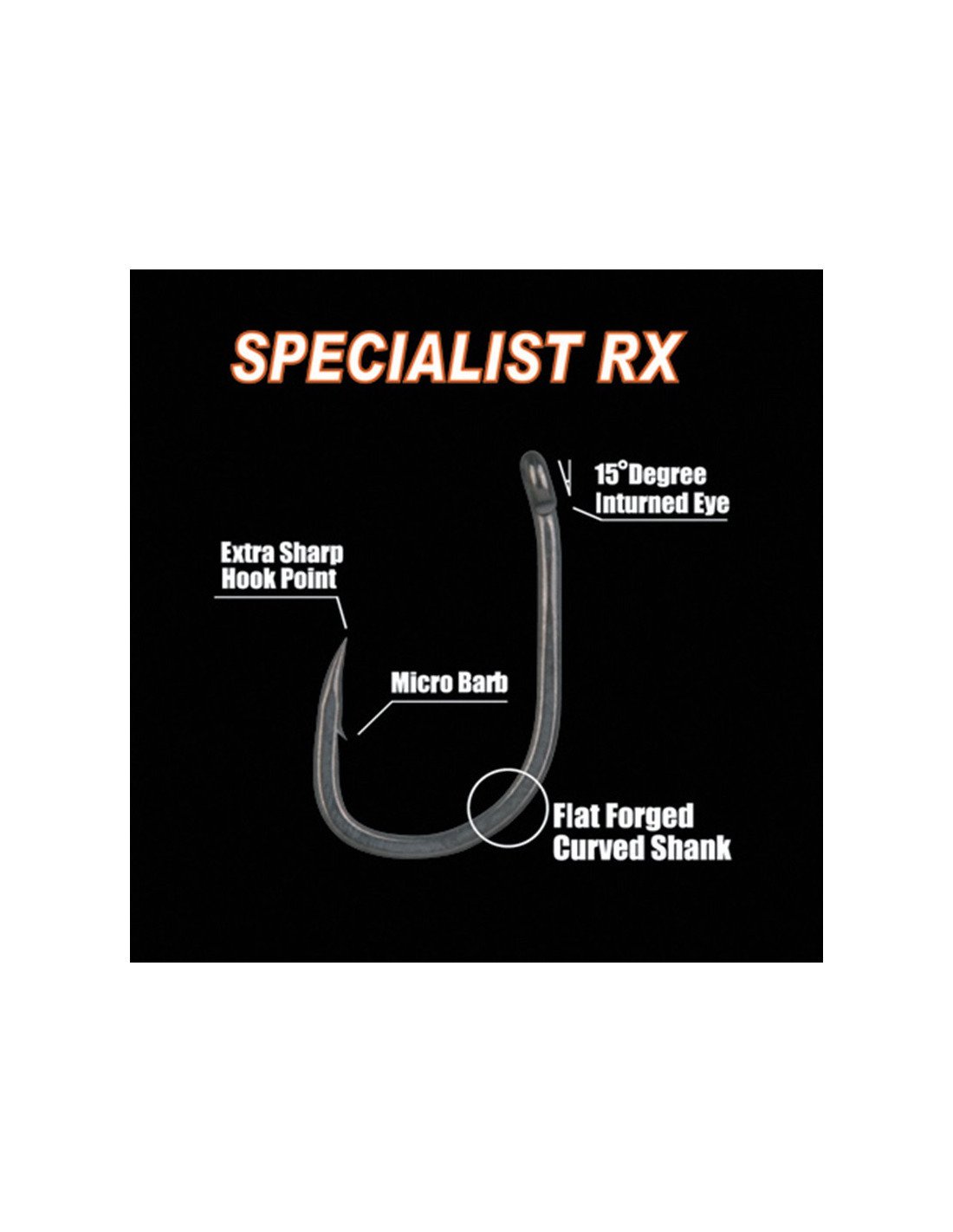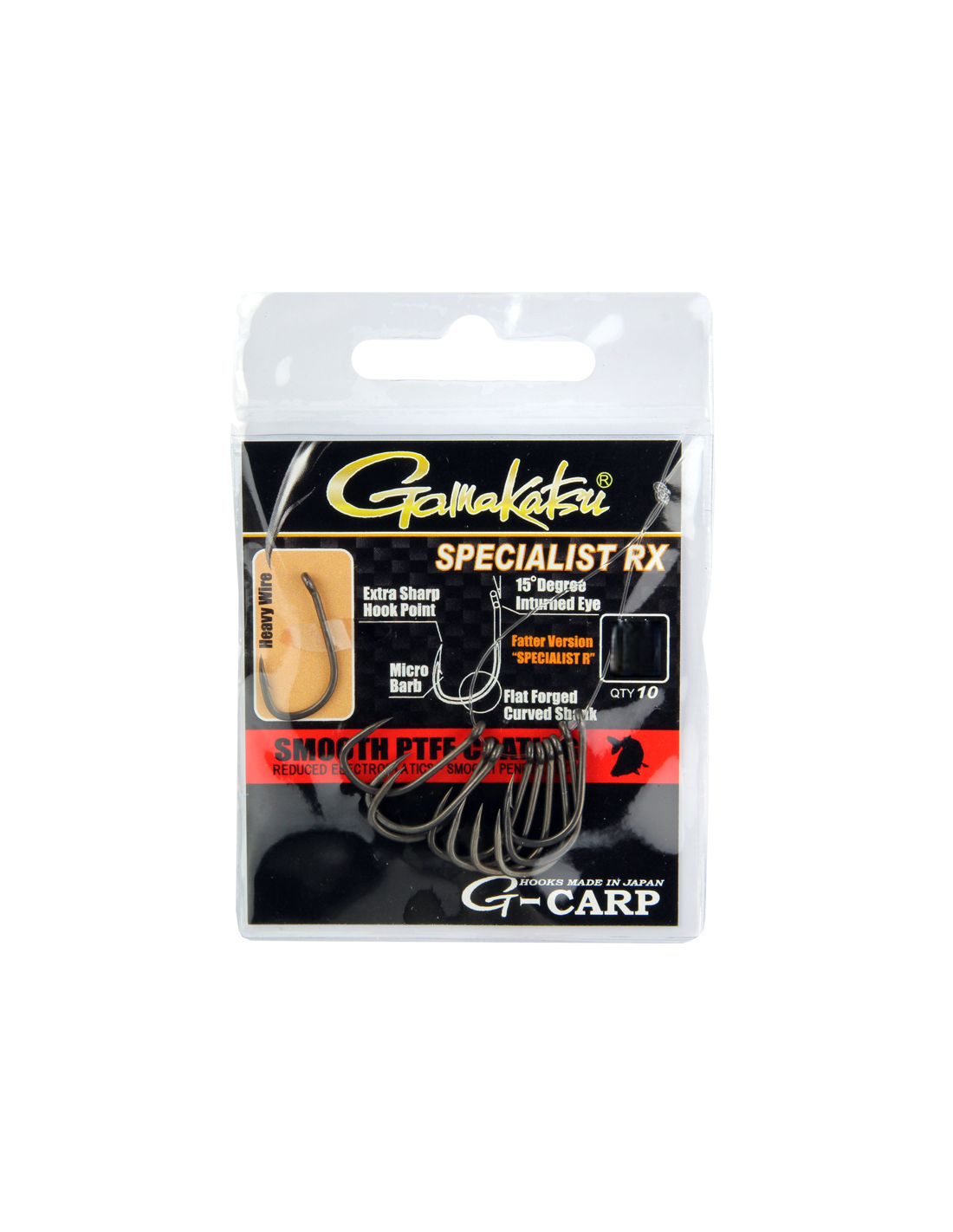 Bei den G-Carp Specialist RX, aus dem Hause Gamakatsu, handelt es sich um einen Schonhaken, mit einem flach geschmiedeten, gebogenen Schaft und 15 Grad, nach innen, gebogenem Öhr, mit Widerhaken.