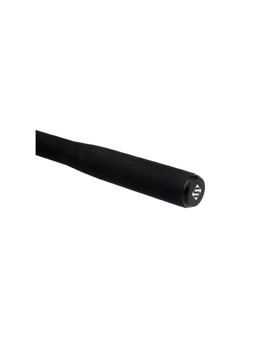 Nicht zu übersehen ist ebenso ihr CNC-gefräster Rollenhalter aus mattem Carbon und ihr schlanker, japanischer Shrink Griff mit schwarz eloxierter Endkappe mit gelasertem S-Logo.