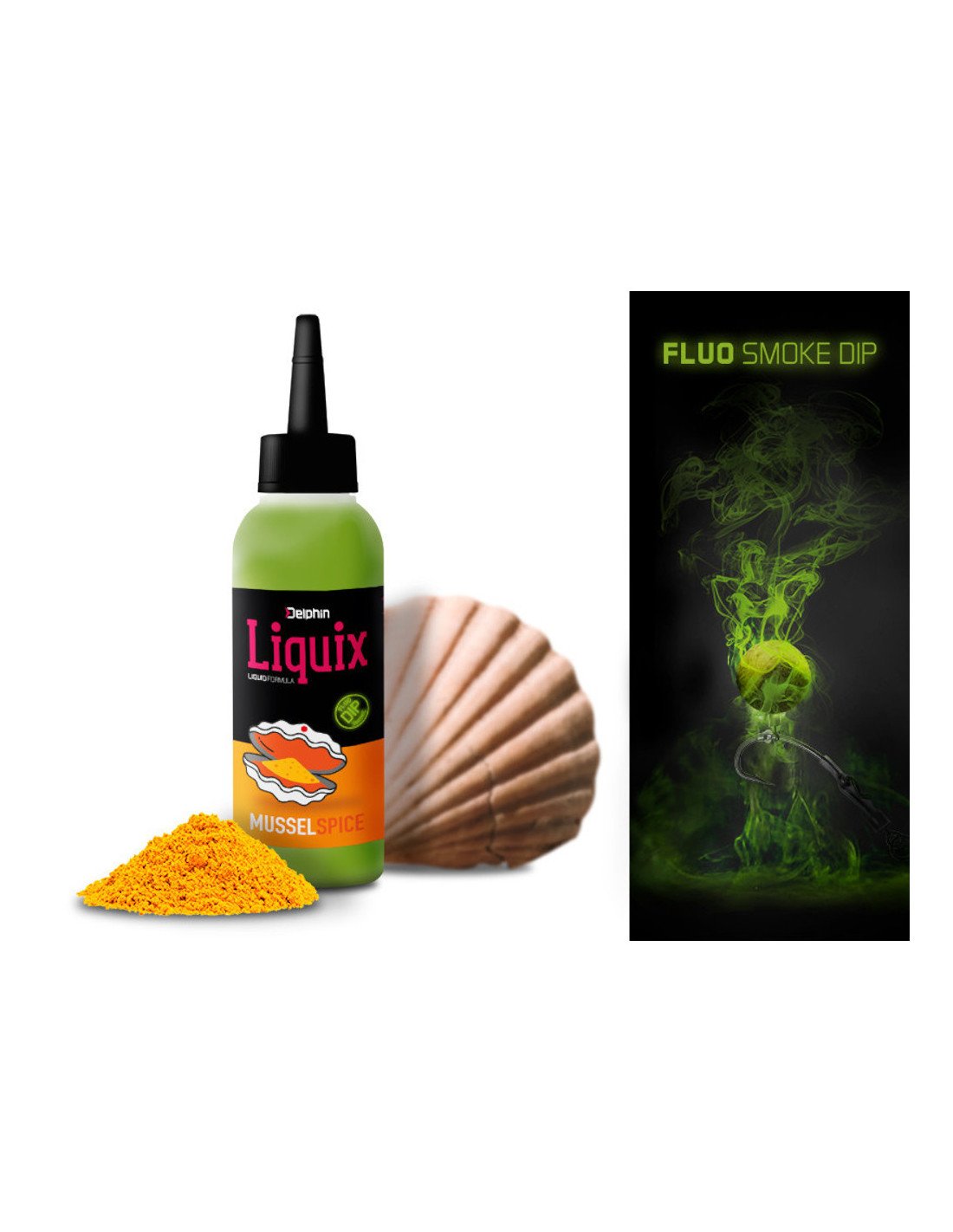 Delphin D SNAX Fluo LiquiX Smoke Mussel Spice Liquid 100ml PVA Friendly Rauchwolken unter Wasser