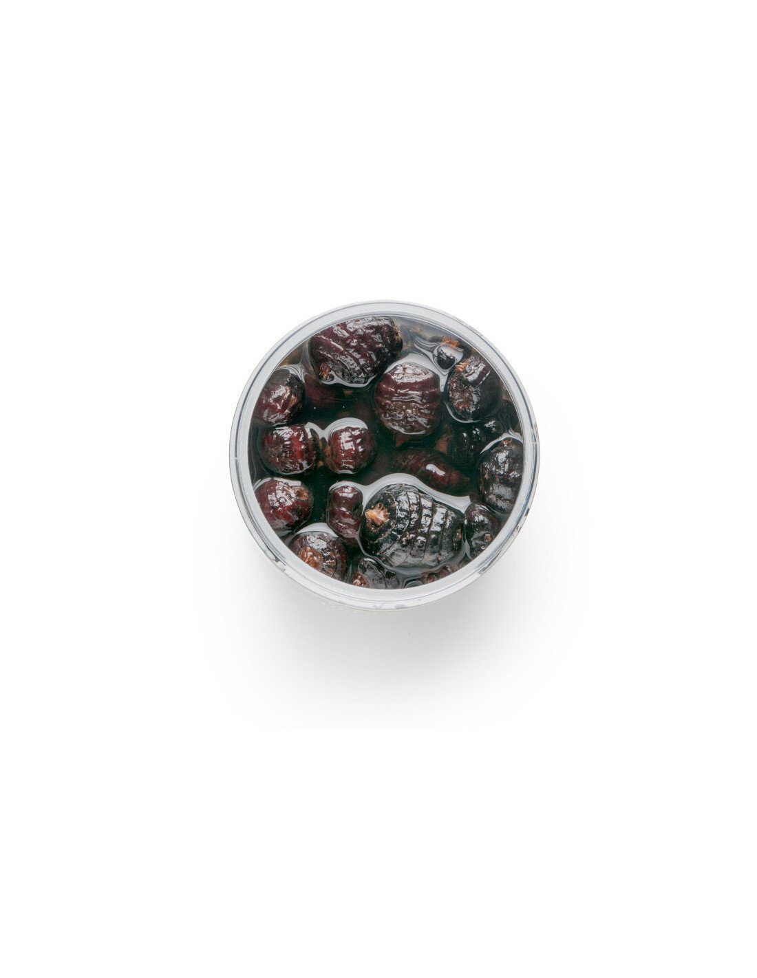 Auswahl eingelegter Erdmandeln in einer speziell aromatisierten Flüssigkeit.