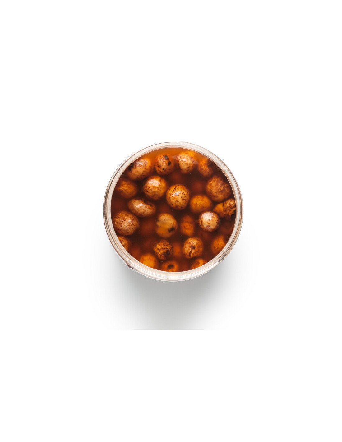 Auswahl eingelegter Erdmandeln in einer speziell aromatisierten Flüssigkeit.