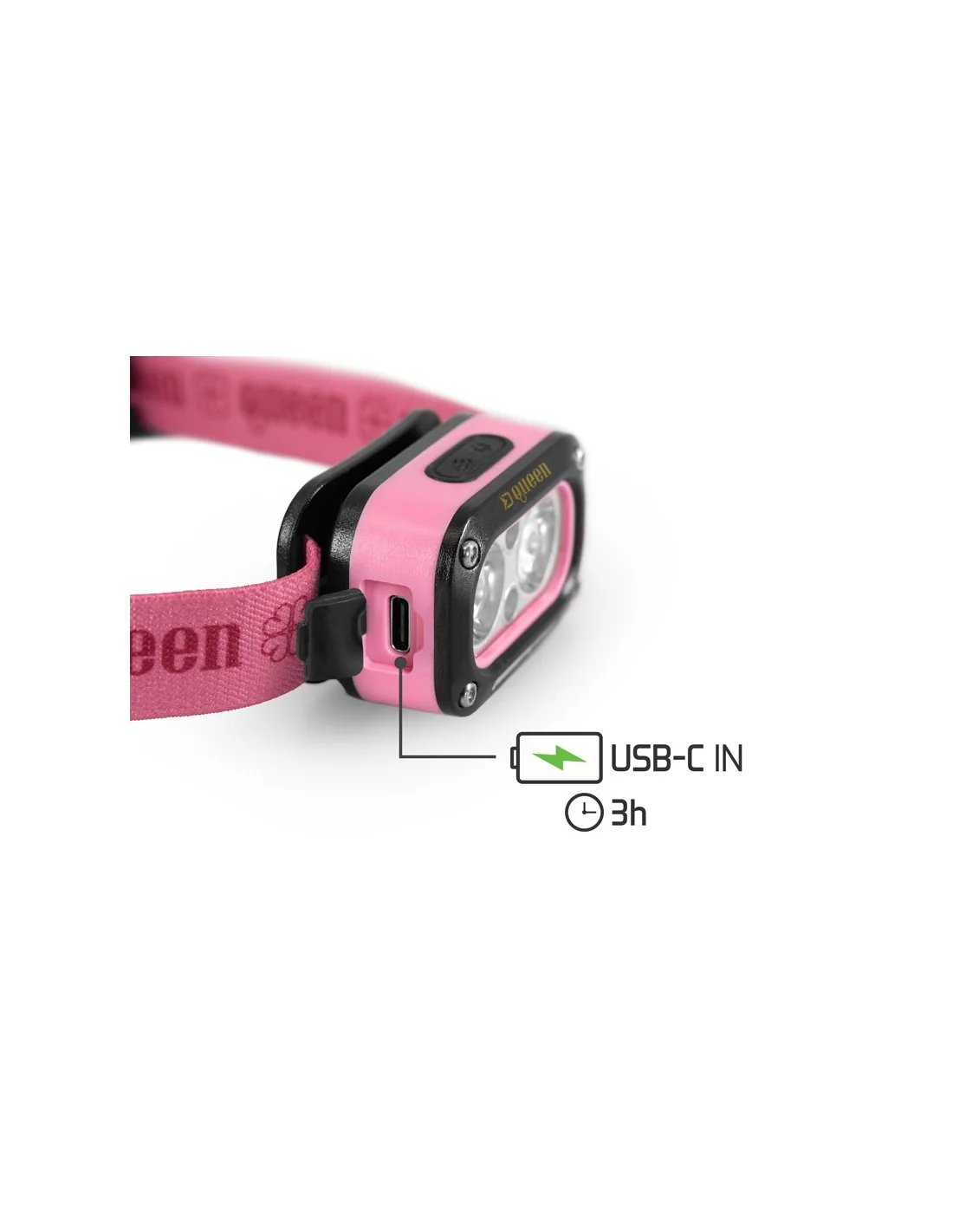 Elegante und kompakte Stirnlampe mit rosa und weißem Licht sorgt für perfekte Sicht und hohen Tragekomfort bei jeder Outdooraktivität.