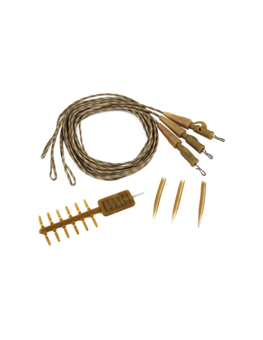 Zusammensetzen tut sich dieses Set aus einem Bleikerngeflecht, einem Lead Clip, Sicherheitsstiften, einem Run Rig Bleihaken und einem Anti-Tagle Sleave zur Herstellung von Vorfächern.