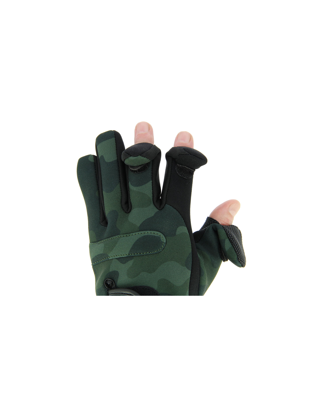 Ein witerer Pluspunkt an den Neopren Camo Gloves ist, dass durch eine spezielle Naht an Damen, Zeige- und Mittelfinger die Fingerkuppen der Handschuhe aufgeklappt werden können und du so deine Montagen trotz Handschuhen sehr genau herstellen kannst oder vollen Kontakt zur Angelschnur hast.