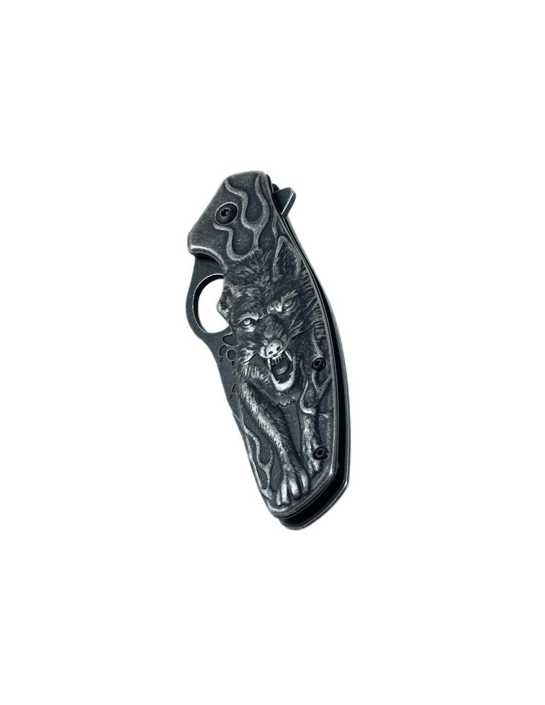 Darüber hinaus lässt sich seine extrascharfe Schneide mit nur einer Hand öffnen und die zwei Pfoten abdrücke, eines Wolfes, runden ihr Design ab.