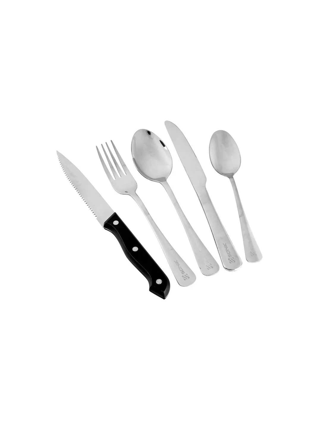 Im Lieferumfang enthalten sind hochwertige Edelstahl-Besteckteile, darunter Messer, Gabel, Esslöffel, Teelöffel sowie ein praktisches Schneidemesser mit schützender Scheide. Alle Komponenten sind robust verarbeitet, langlebig und spülmaschinenfest, wodurch eine einfache Reinigung und langfristige Nutzung gewährleistet wird.