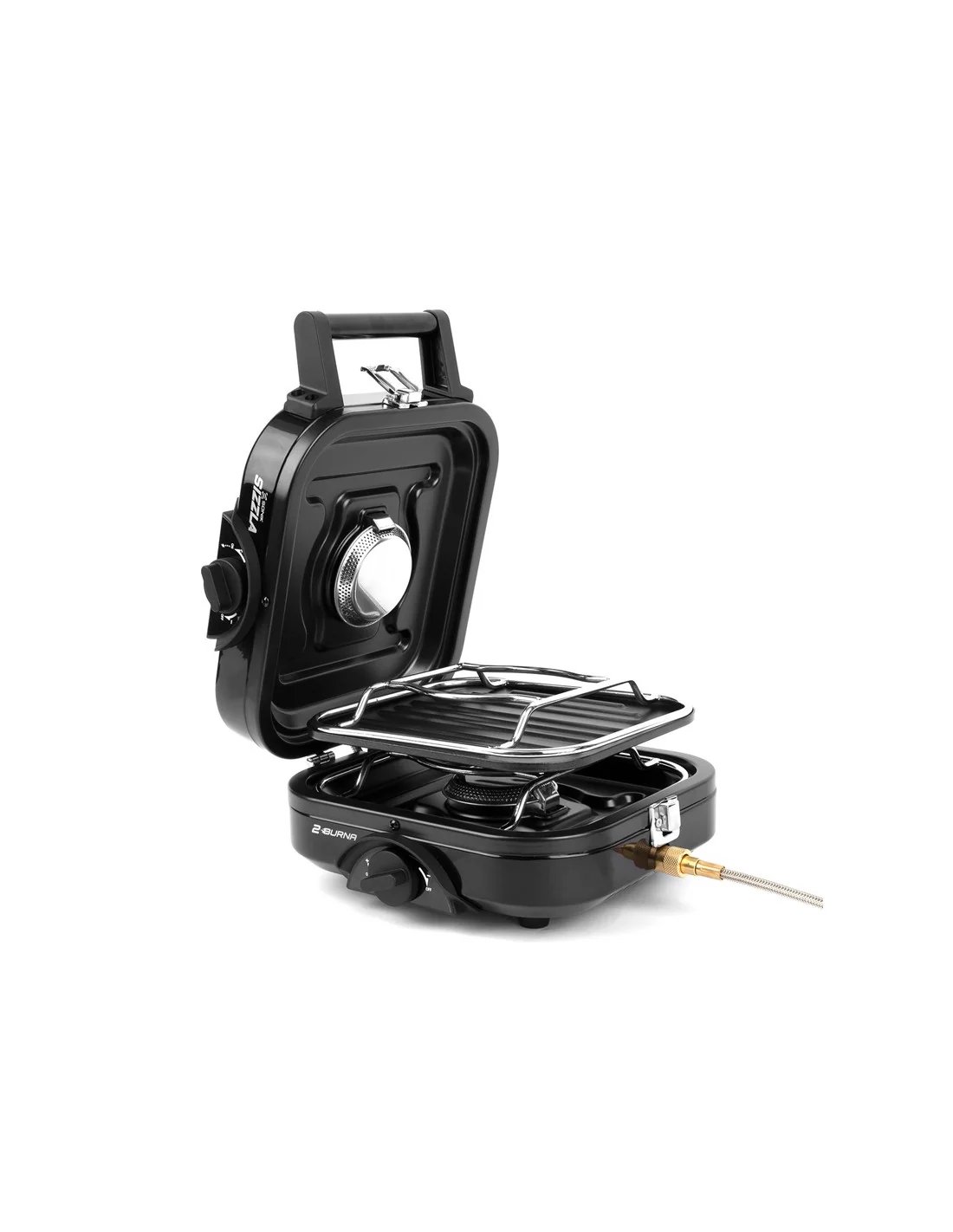 Dank der zwei separat regulierbaren Brenner lässt sich die Hitze präzise steuern, sodass mehrere Speisen gleichzeitig zubereitet werden können. Die integrierte Piezozündung per Knopfdruck ermöglicht ein schnelles und sicheres Starten ohne zusätzliches Zubehör. Der Aufbau ist besonders benutzerfreundlich: einfach aufklappen, Gaskartusche anschließen und sofort loslegen.