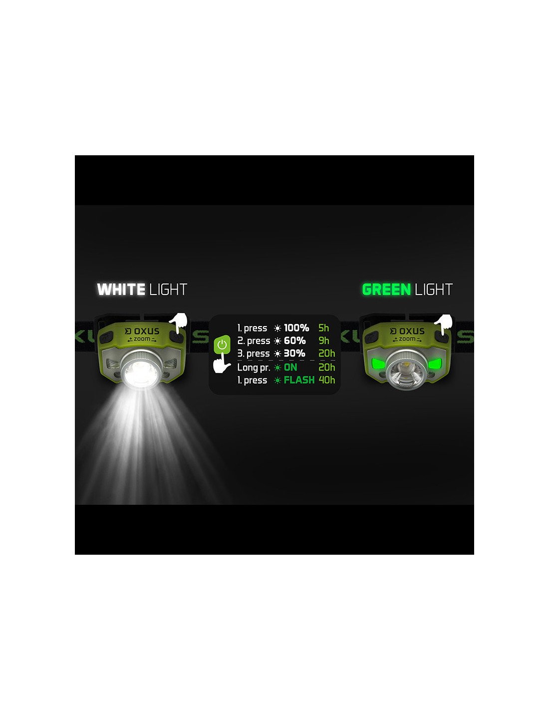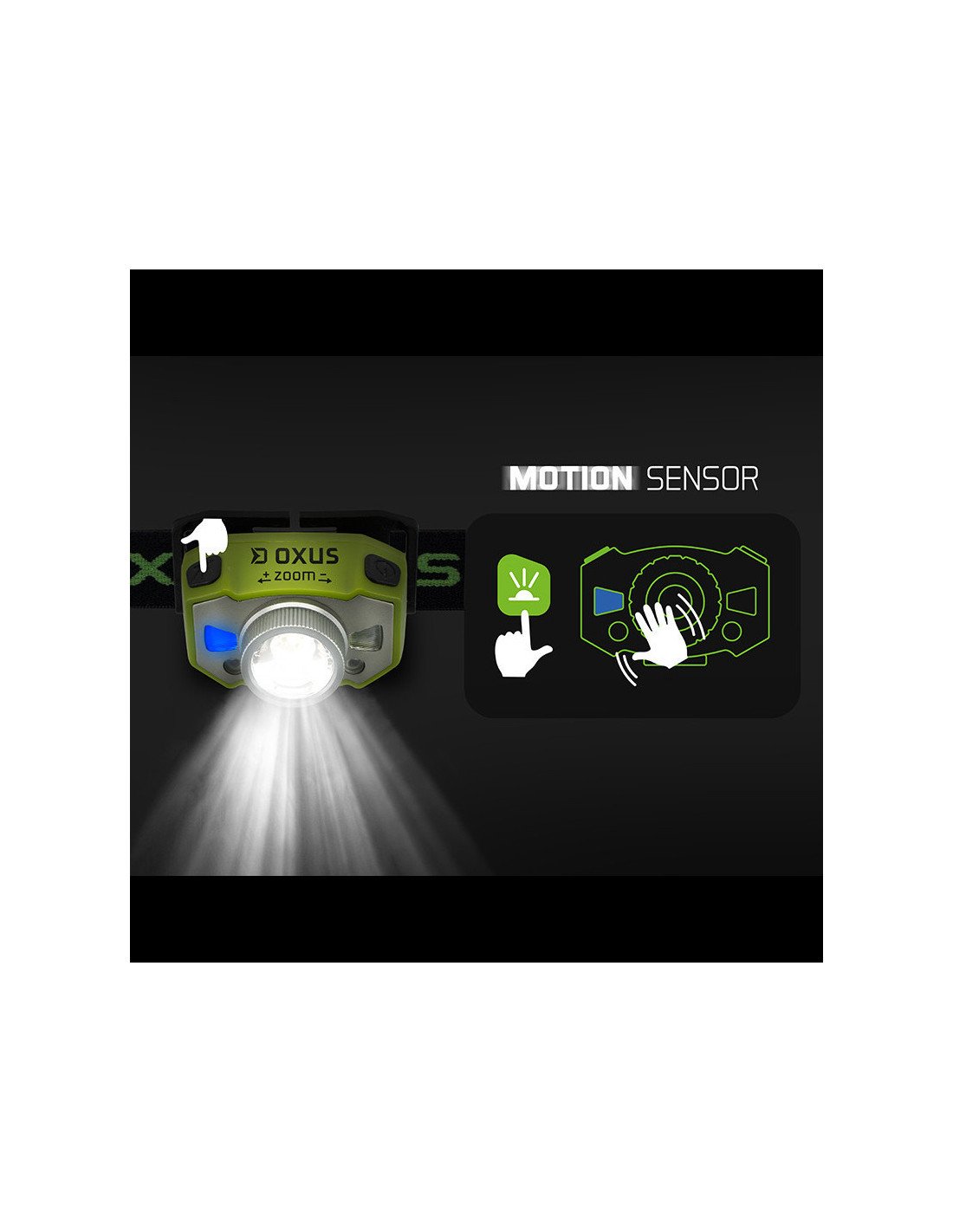 Die Stirnlampe hat eine Leistung von 5 W und eine Lichtstärke von bis zu 300 lm. Dank dieser Parameter und der Möglichkeit, den Lichtstrahl zu fokussieren, wird es kein Problem sein, Ihre unmittelbare Umgebung, aber auch die entfernten Ziele ausreichend zu beleuchten. OXUS ZOOM ist mit einem Bewegungssensor ausgestattet, der das Ein- und Ausschalten mit einer Handbewegung erleichtert.