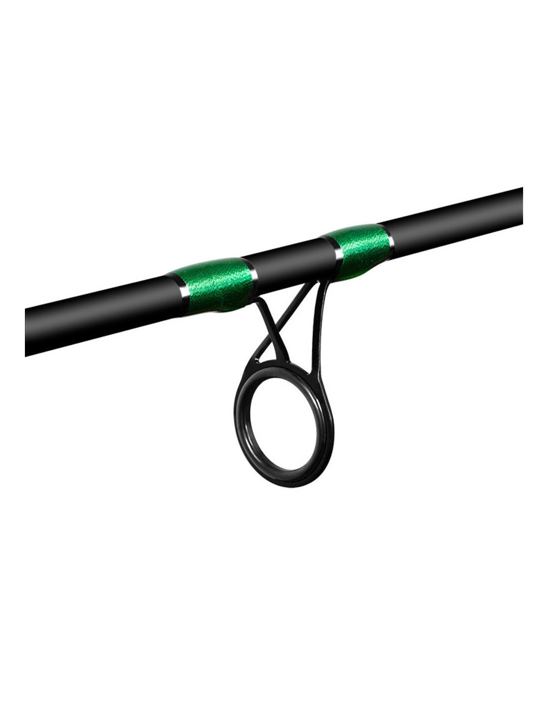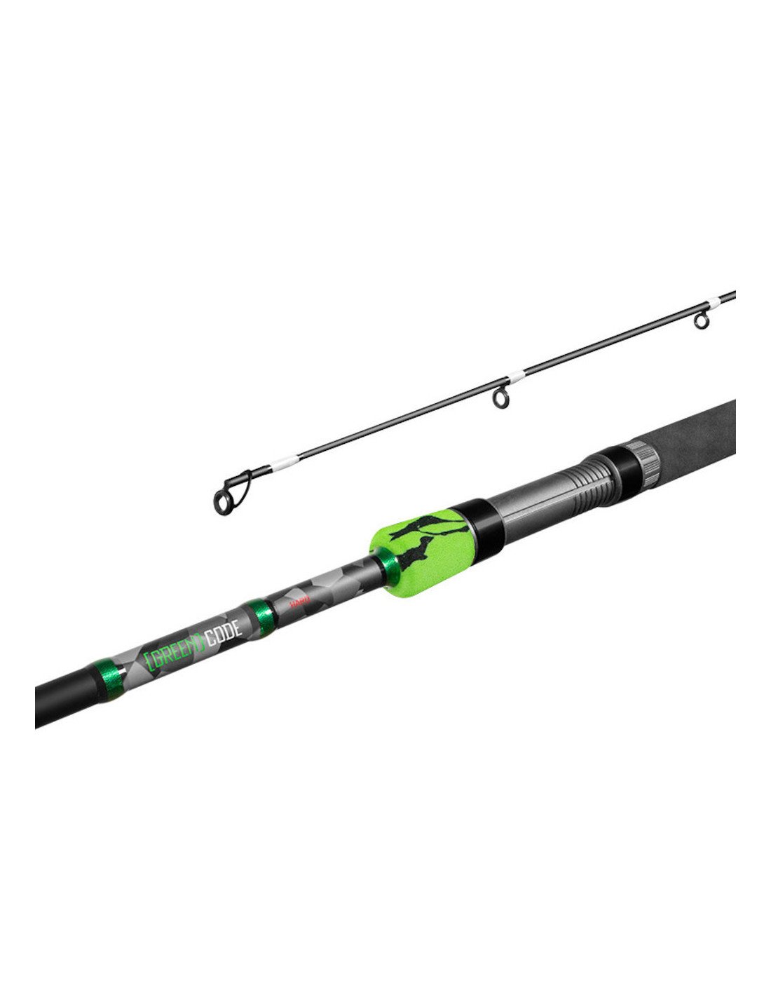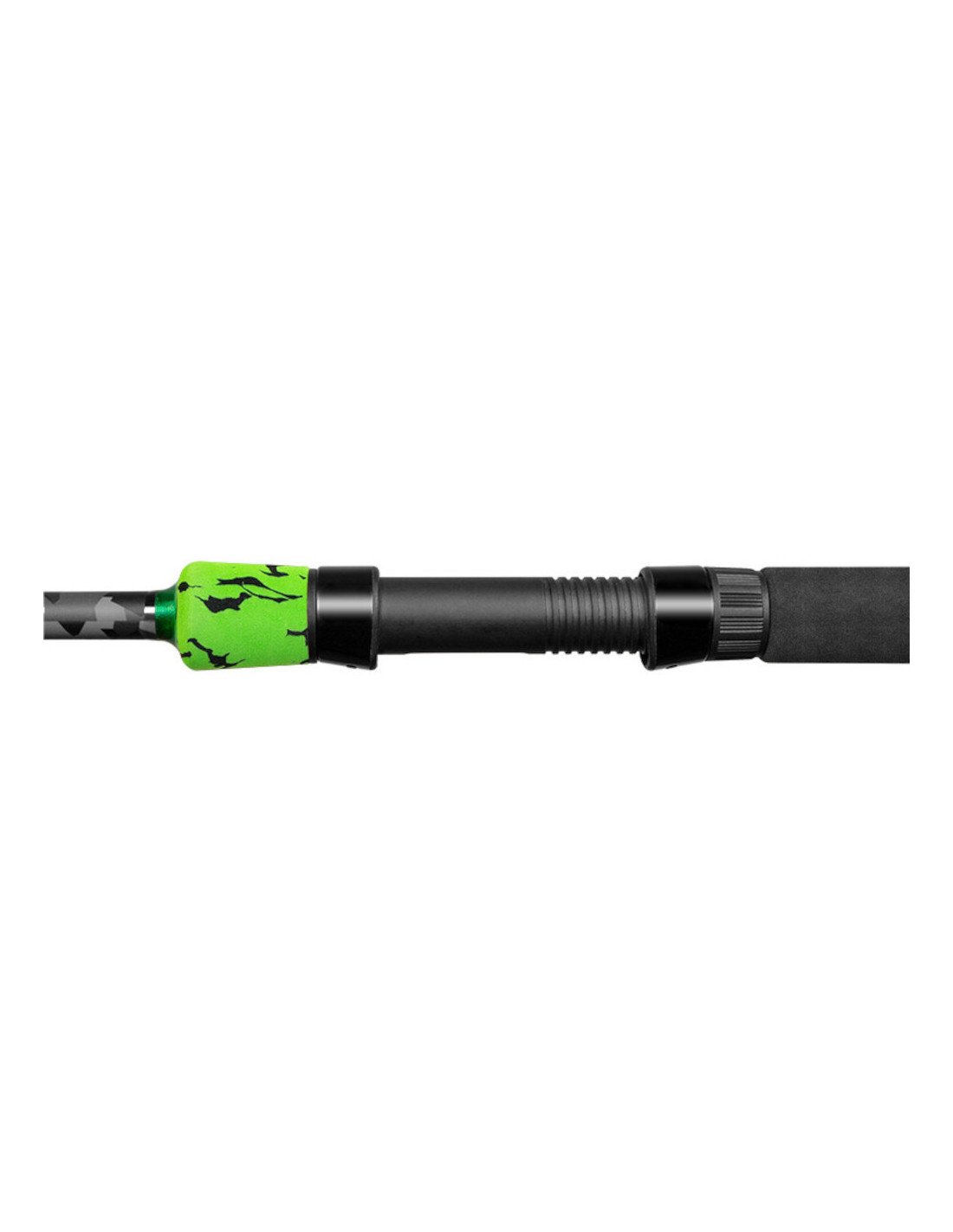 Der Vollgriff aus einer Kombination aus dem schwarzen EVA-Schaumstoff und der grün-schwarzen Camouflage passt perfekt, bietet aber gleichzeitig den Komfort beim Angeln und die Möglichkeit, die Rute bei großen Fischen richtig zu greifen. Oberhalb des Griffs findest du eine grüne Wicklung mit einer einzelnen roten Umwicklung, die nur die härtere GreenCODE Hard Serie kennzeichnet.