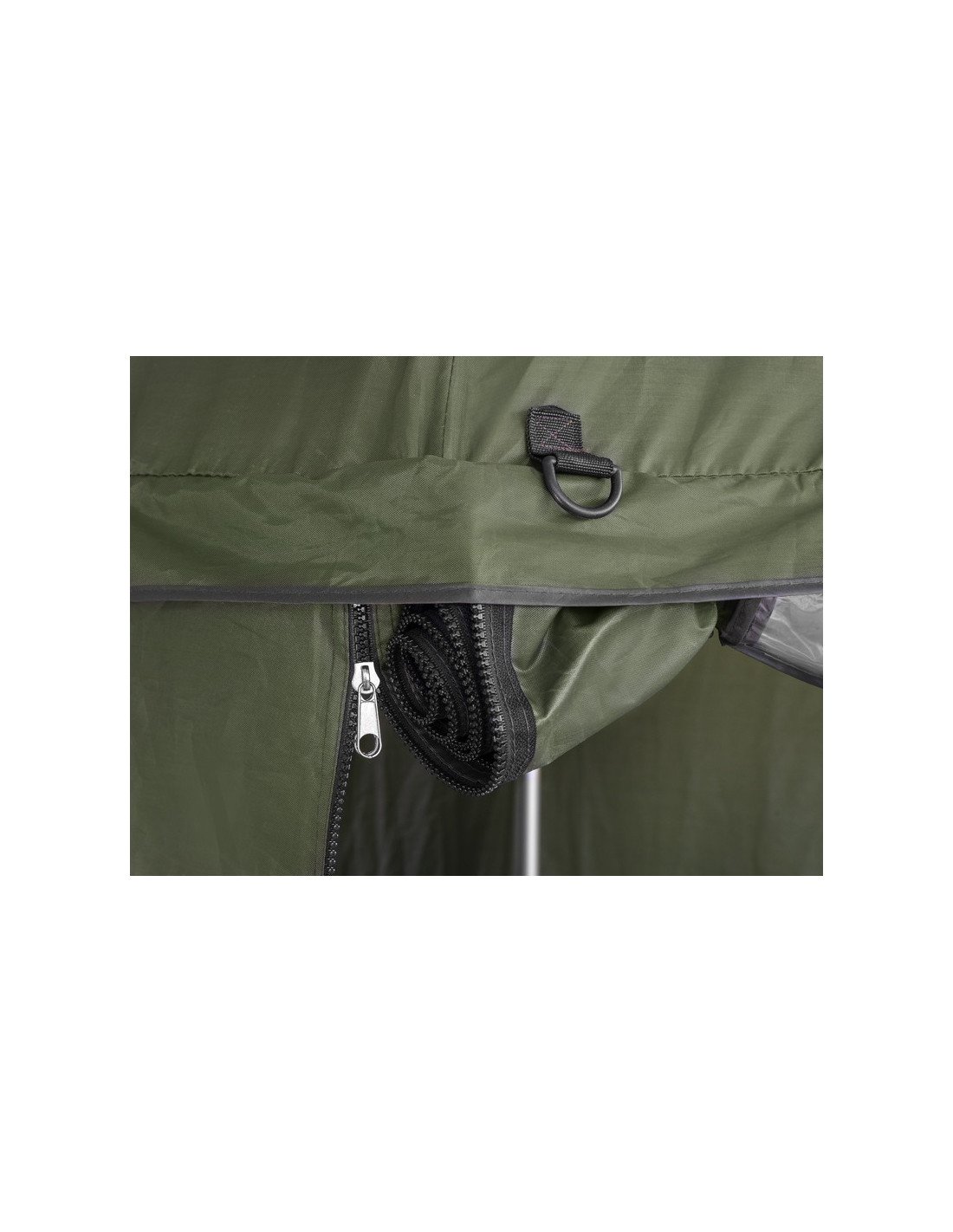 Die verlängerte Seitenwand schützt Dich von allen Seiten, während die Tür mit hochwertigen Reißverschlüssen und das transparente Kunststofffenster es Dir ermöglichen, Deine Ruten jederzeit im Blick zu behalten.