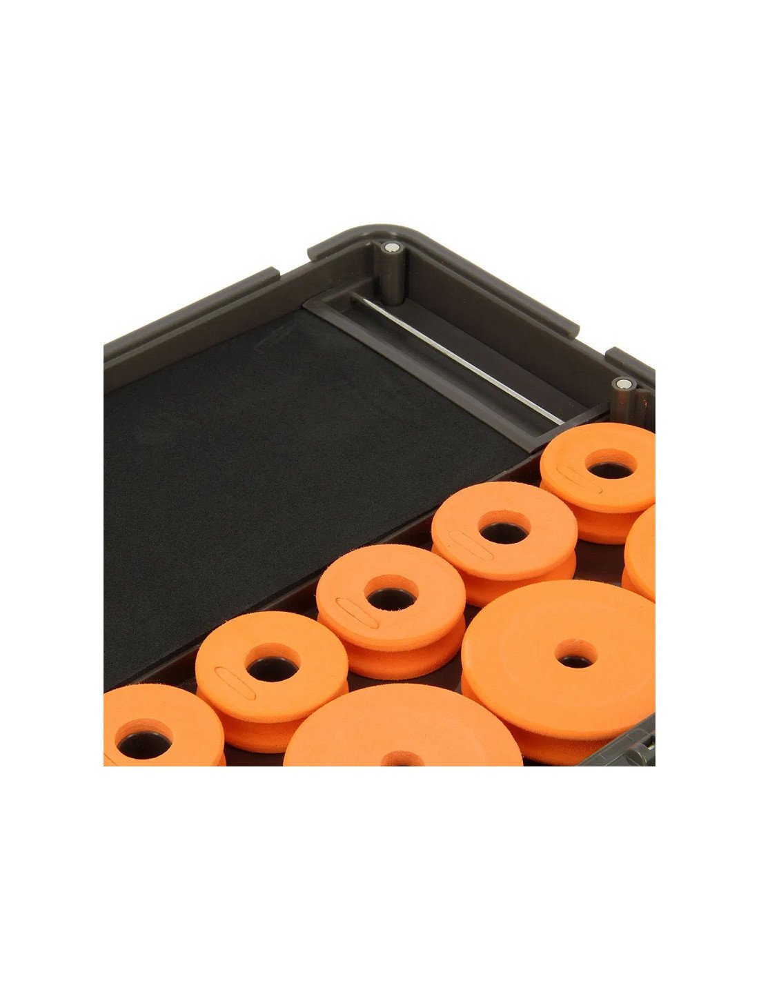 Ein EVA-Rig Board bietet Raum für etwa 20 montierte Hair Rigs, sieben kleine und fünf große orangefarbene EVA-Winder, sodass alles perfekt organisiert bleibt.