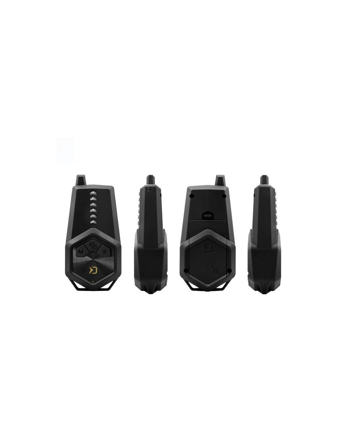 Der Empfänger selbst zeichnet sich durch einen zuverlässigen Signalempfang aus, je nach den Bedingungen bis zu einer Entfernung von 200 Metern. Es bietet die Möglichkeit, eine von 8 Lautstärkestufen einzustellen und die Vibration während des Bisses ein- oder auszuschalten. Der Signalton am Empfänger ist identisch mit dem Ton, den Sie an den einzelnen Bissanzeigern ausgewählt haben. Sie werden durch einen anderen Signalton auf einen Rückbiss oder "Fallbiss" aufmerksam gemacht. Dank seiner detaillierten Form kann er senkrecht auf einen Tisch gestellt oder mit einem Riemen mit der Schleife (im Lieferumfang enthalten) aufgehängt werden. Alle gewählten Einstellungen sowohl für den Bissanzeiger als auch für den Empfänger werden im Speicher gespeichert.