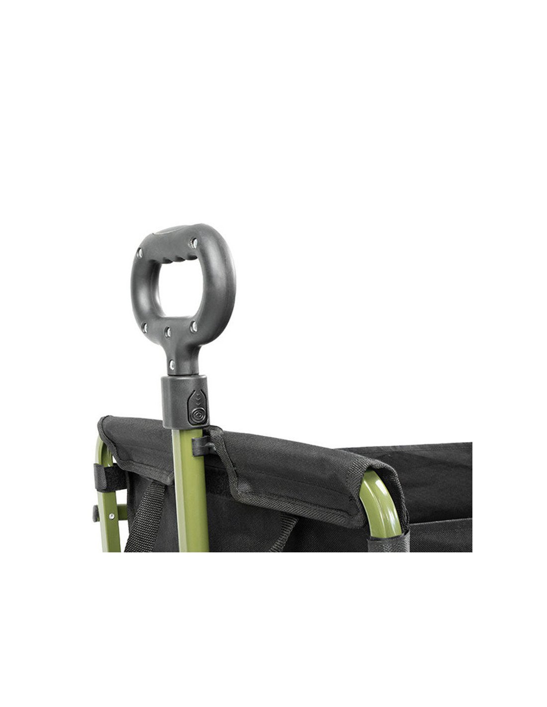 Vervollständigt wird der Transportwagen durch einen Teleskopstiel mit einem Kunststoffgriff. Durch einen Knopf am Griff kannst du den Stiel, für den Transport, zusammenschieben. Anschließend lässt du den Stiel, in die dafür vorgesehene Kunststoffhalterung, einrasten.