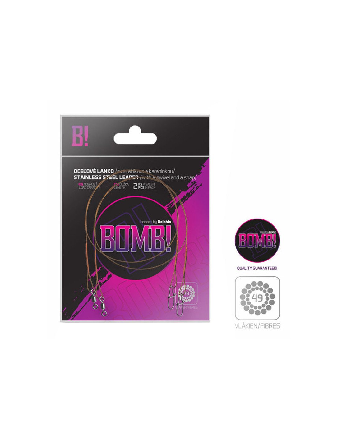 Das Bomb! Stahlvorfach mit Wirbel und Karabiner, aus dem Hause Delphin, ist aus 49 Stahlfäden geflochten.