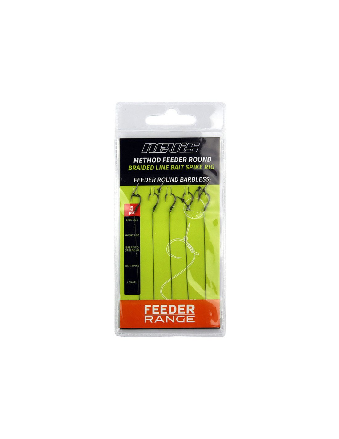 Beim Method Feeder Bait Spike Rig, aus dem Hause Nevis, handelt es sich um ein Feeder-Vorfach, das mit einem Feeder Round Hook und einem Bayonet ausgestattet ist.