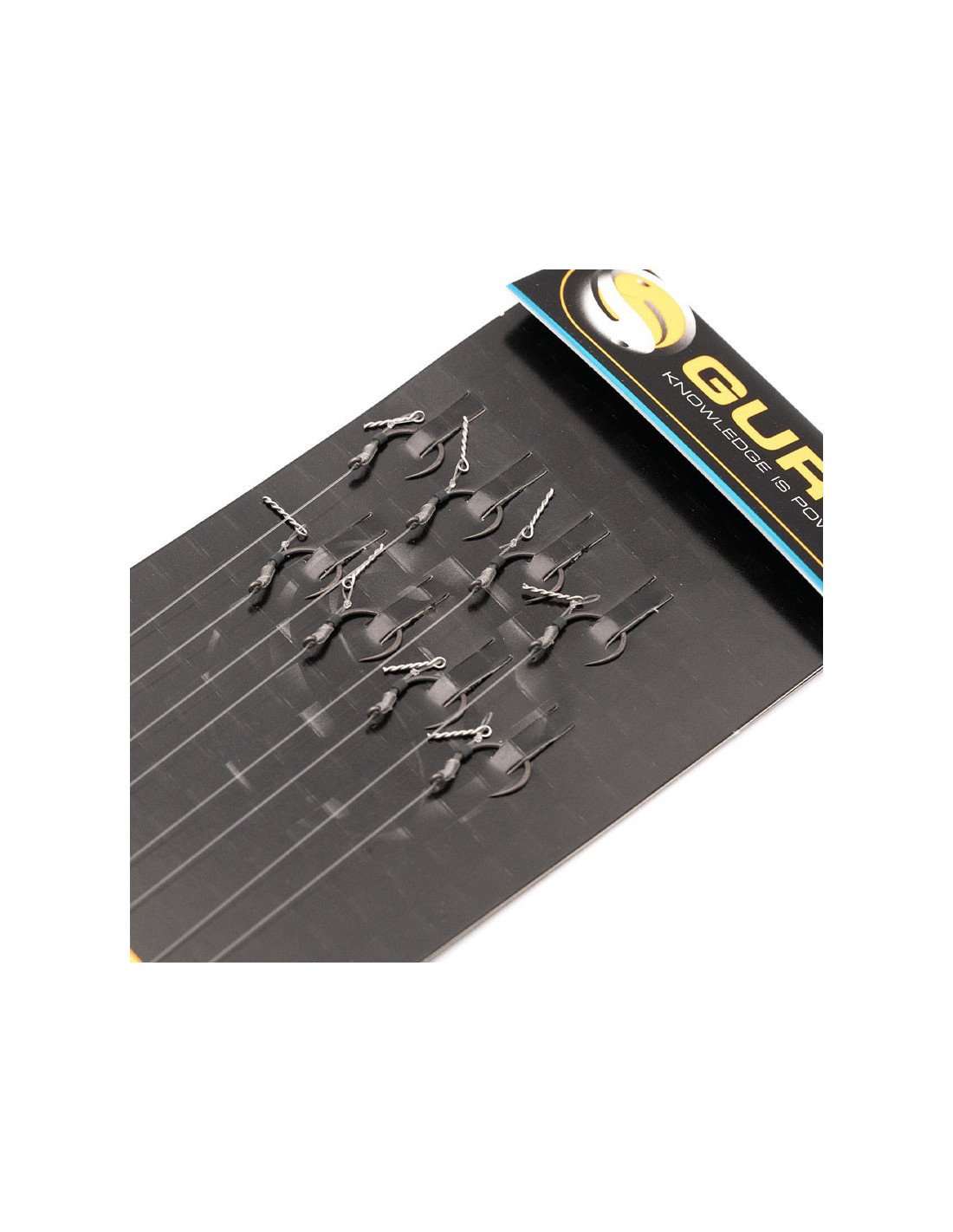 Ausgestattet ist dieses fertige Vorfach mit einem QM1-Haken mit einer einzigartigen, stark geschwungenen Form, einem kurzen Schaft und einer immens scharfen Hakenspitze, die für einen exzellenten Hakenhalt sorgt und Fischverluste extrem reduziert. Zudem verfügt der Haken über eine PTFE-Beschichtung, die seine Haltbarkeit, Schärfe und Langlebigkeit deutlich verbessert. Gebunden ist dieser Angelhaken an die bewährte N-Gauge Schnur, ebenfalls von Guru.