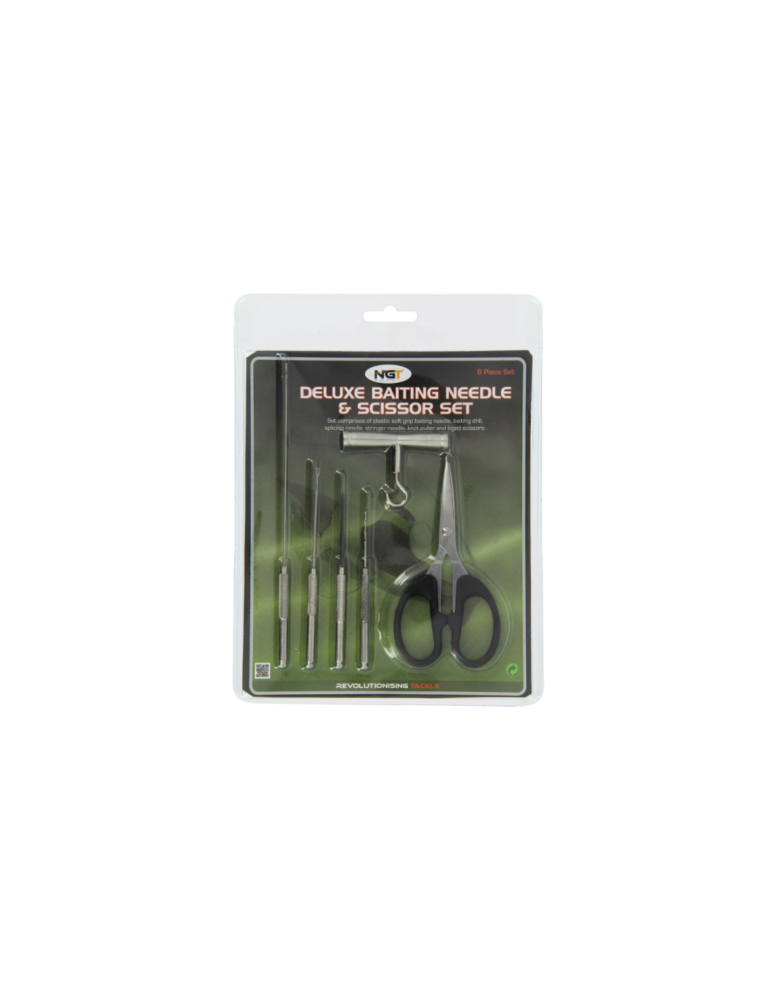 Das Needle Stainless Steel Baiting Tool Set, aus dem Hause NGT, beinhaltet 4 Ködernadeln, eine Schere und einen Knotpuller.