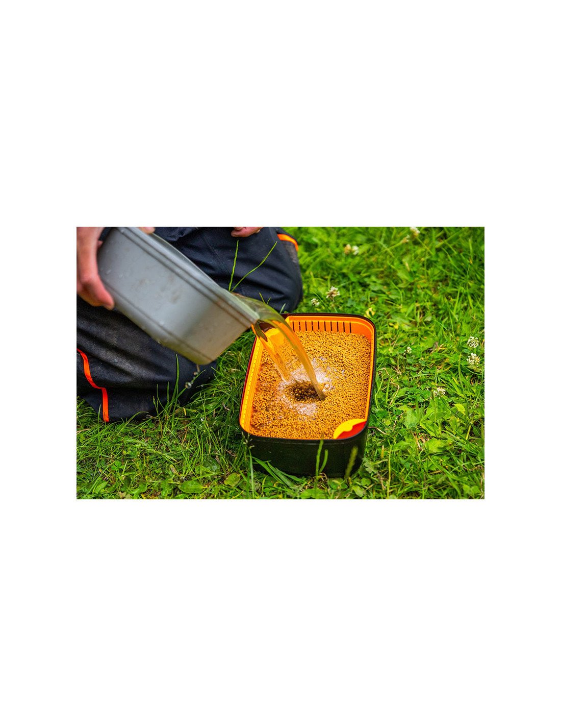 Dank seines größeren Fassungsvermögens eignet sich das Ködersieb ideal für größere Ködermengen. Du kannst zum Beispiel 1kg Pellets auf einmal einweichen und abseihen. Hierfür gibst du die Pellets ins Sieb und stellst anschließend das Ködersieb in einen Kübel (nicht inkludiert), der mit Wasser gefüllt ist. Haben die Pellets genügend Zeit gehabt, um einzuweichen, so ziehst du das Sieb an den Ecken aus dem Wasser und lässt die Pellts abtropfen.