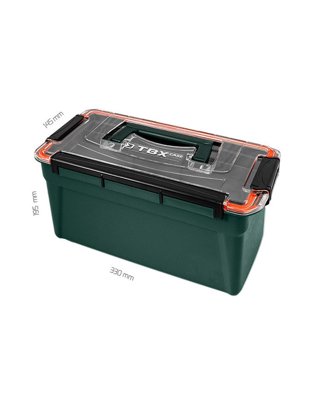 The dark green TBX Case Clip, from Delphin, is a small case with a transparent lid, which is provided around with a red sealing rubber.